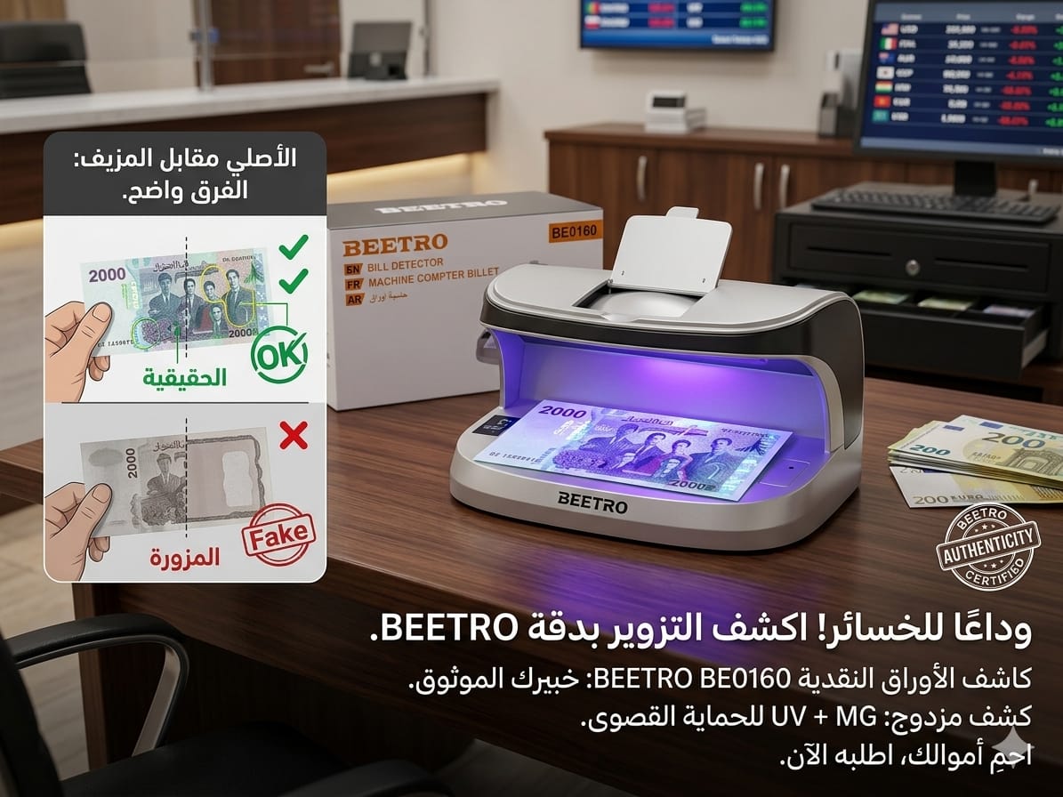 في وقت كثر فيه “التزوير” وتطورت طرق الاحتيال، يأتي جهاز BEETRO BE0160 ليكون السد المنيع لتجارتك. بفضل تقنياته المتطورة في الكشف بالأشعة فوق البنفسجية، يمنحك سرعة ودقة متناهية للتأكد من كل “ورقة” تدخل صندوقك، لتعمل براحة بال تامة (وتهنى من الشك)