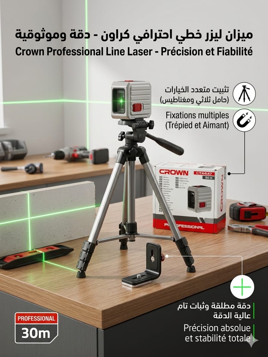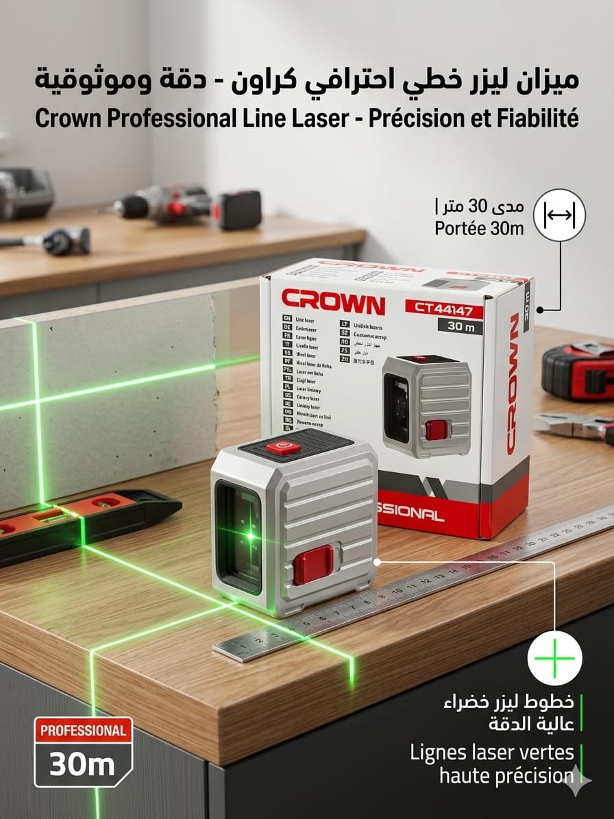 وداعاً لـ “الخيط” و”الميزان المائي” التقليدي الذي يضيع وقتك. مع Niveau Laser Crown 30M، ستحصل على خطوط مستقيمة تماماً بلمسة زر واحدة. سواء كنت “بلاط” (Tailleu)، “بلاكِيست” (Plaquiste)، أو هاوي “بريكولاج”، هذا الجهاز هو رفيقك الأول في لضمان عمل “مريغلي” 100%.