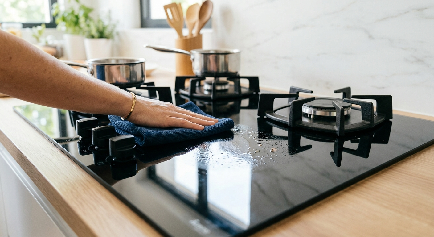 1. سطح من الزجاج المقسى (Verre Trempé): أناقة وسهولة في التنظيف