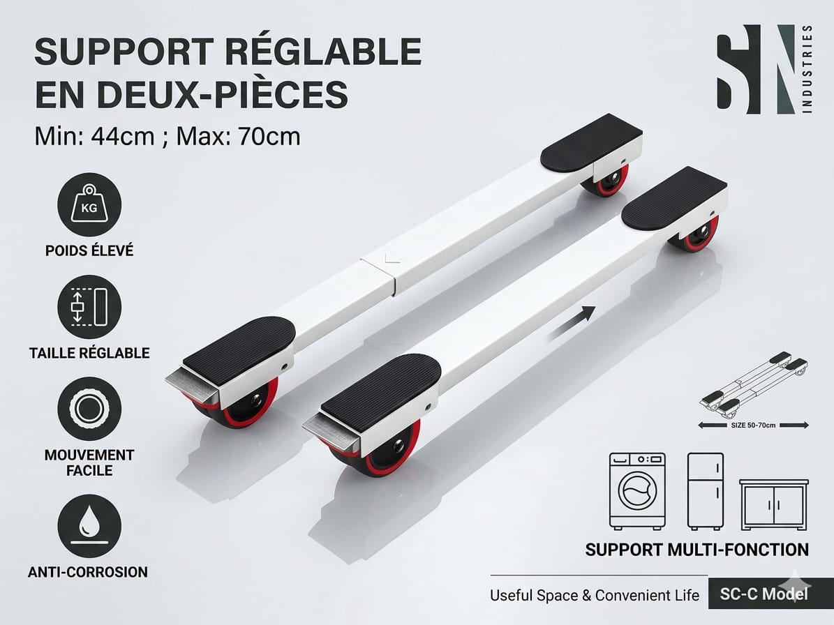 قياس “Sur Mesure” لكل الأجهزة: بفضل خاصية التعديل التي تبدأ من 44 سم وتصل إلى 70 سم، هذا الحامل “يركب” على أي جهاز عندك. سواء كانت غسالة ملابس، غسالة أواني، أو حتى أضخم ثلاجة، الحامل يتأقلم مع حجمها تماماً.
